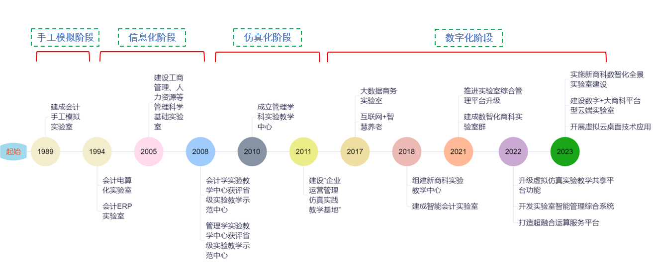 信息化阶段:1994年之后相继建设会计电算化实验室、会计ERP实验中心。2005年建设工商管理、人力资源管理实验室等管理科学基础实验室。2008年,会计学综合实验教学中心、管理学实验教学中心获评省级实验教学示范中心。